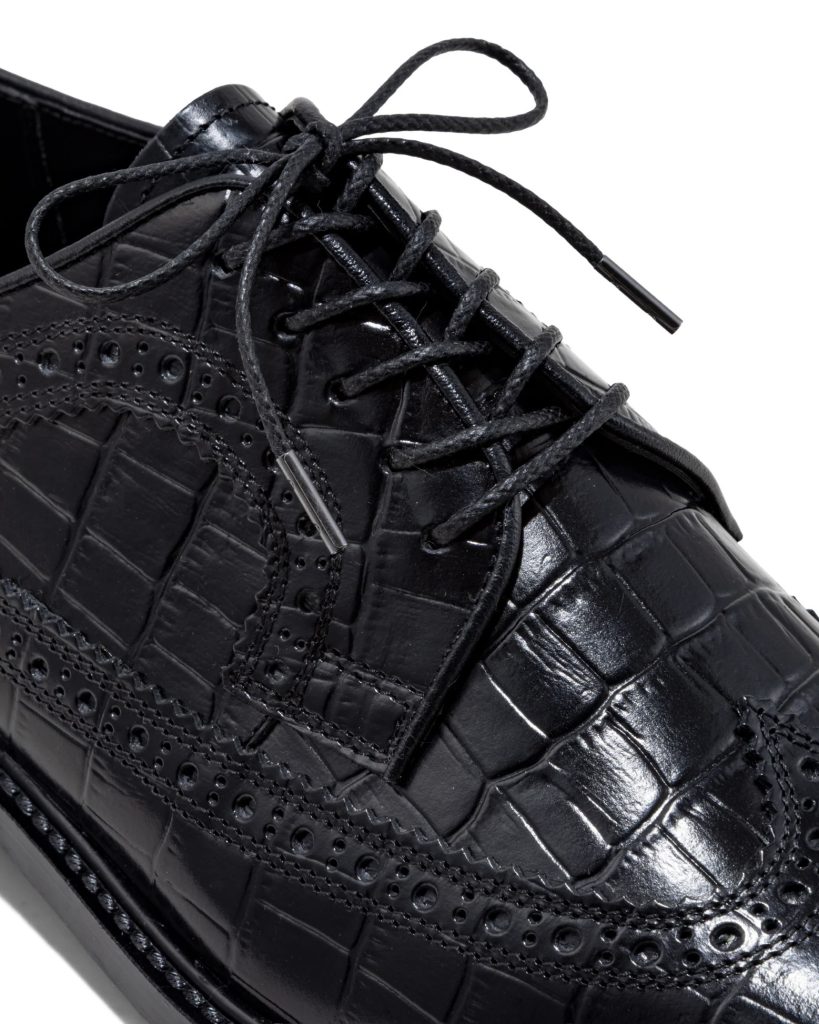 ブランドが誕生した1986年の1stコレクションにラインアップされていたアーカイブを活用し、ローファー同様に既存の日本製革靴にはない要素を加え発信をするヒモ靴の第一弾。踵下と土踏まずをサポートするクッションインソールを採用し、履き始めからストレスを感じにくい、日常使いに最適なスペックを備えています。クラシックローファーでも人気のクロコダイル型押しを追加します。ウイングチップは、つま先部分の革の切り替えがW字型になっており、このW字の切り替えが鳥の翼(wing)のように見えることから、その名前がついたと言われています。華やかで存在感のあるレザーシューズに、< The Kenford Fineshoes >らしい要素を加え発信します。
